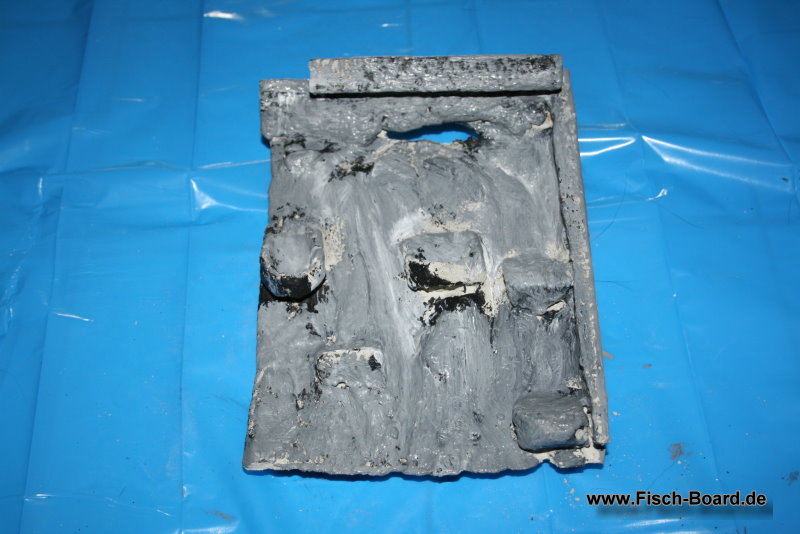 Dann kam die Styroporplatte auf die Rutsche. Die hab ich auf das Glas geklebt und zurecht geschnitten, so das es schön ins Becken passt.