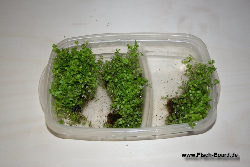 Nach dem sauber machen hab ich die Pflanzen in einen Wasserbehälter "eingetopft". Da werden sie jetzt so 1 bis 2 Wochen verbringen und wässern, mit täglichem Wasserwechsel.