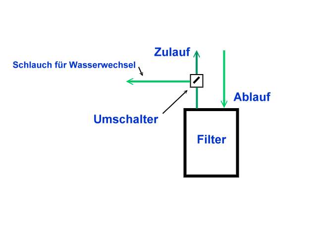 Am Zulauf komnmt eine Art "Umschalter". Durch den Umschalter wird das Wasser nicht mehr ins Becken gepumpt sondern über einen Schlauch in den Abfluß.