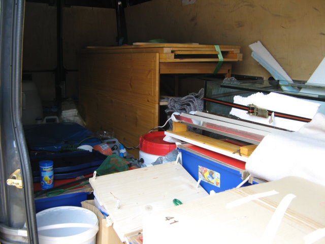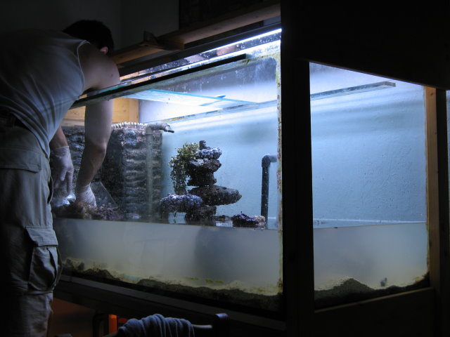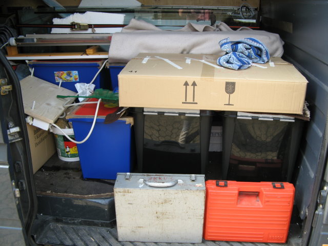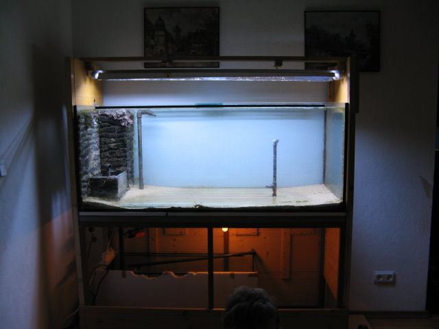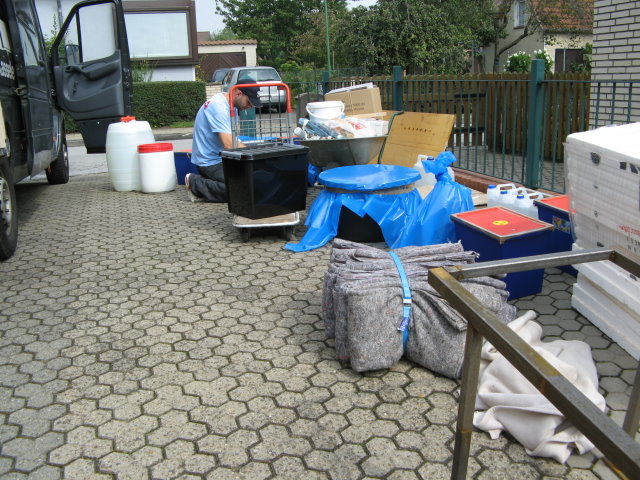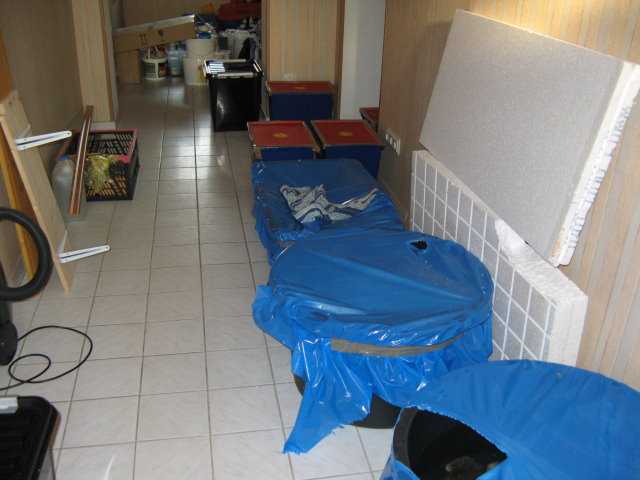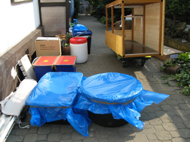 Wärend ich die vorher durchgesägten Rohre wieder anklebte, die zum Technikbecken gehn, haben die Helfer langsam alle Behälter nach oben geschleppt.
